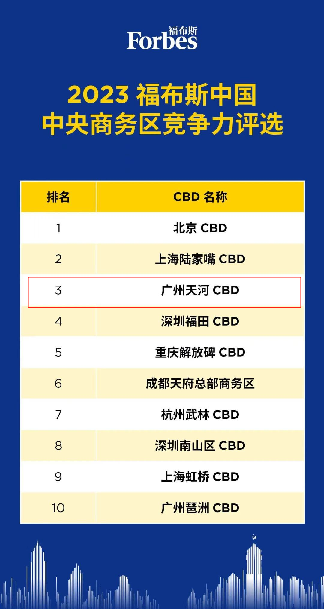 11月28日,福布斯中国正式发布 “2023福布斯中国商务中心区竞争力评选”结果,其中广州天河CBD位列第三。